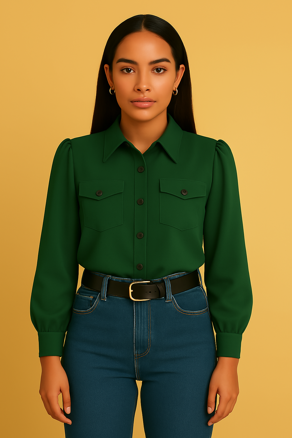 A blusa apresenta uma gola estruturada que remete à alfaiataria clássica, mas com uma abordagem moderna e feminina. Essa gola não apenas emoldura o rosto com elegância, como também adiciona um toque de autoridade e sofisticação ao visual. Os punhos largos com fechamento em botões reforçam essa estética refinada, criando uma continuidade visual com a gola e oferecendo a possibilidade de usar as mangas levemente dobradas ou totalmente estendidas, dependendo do estilo desejado.