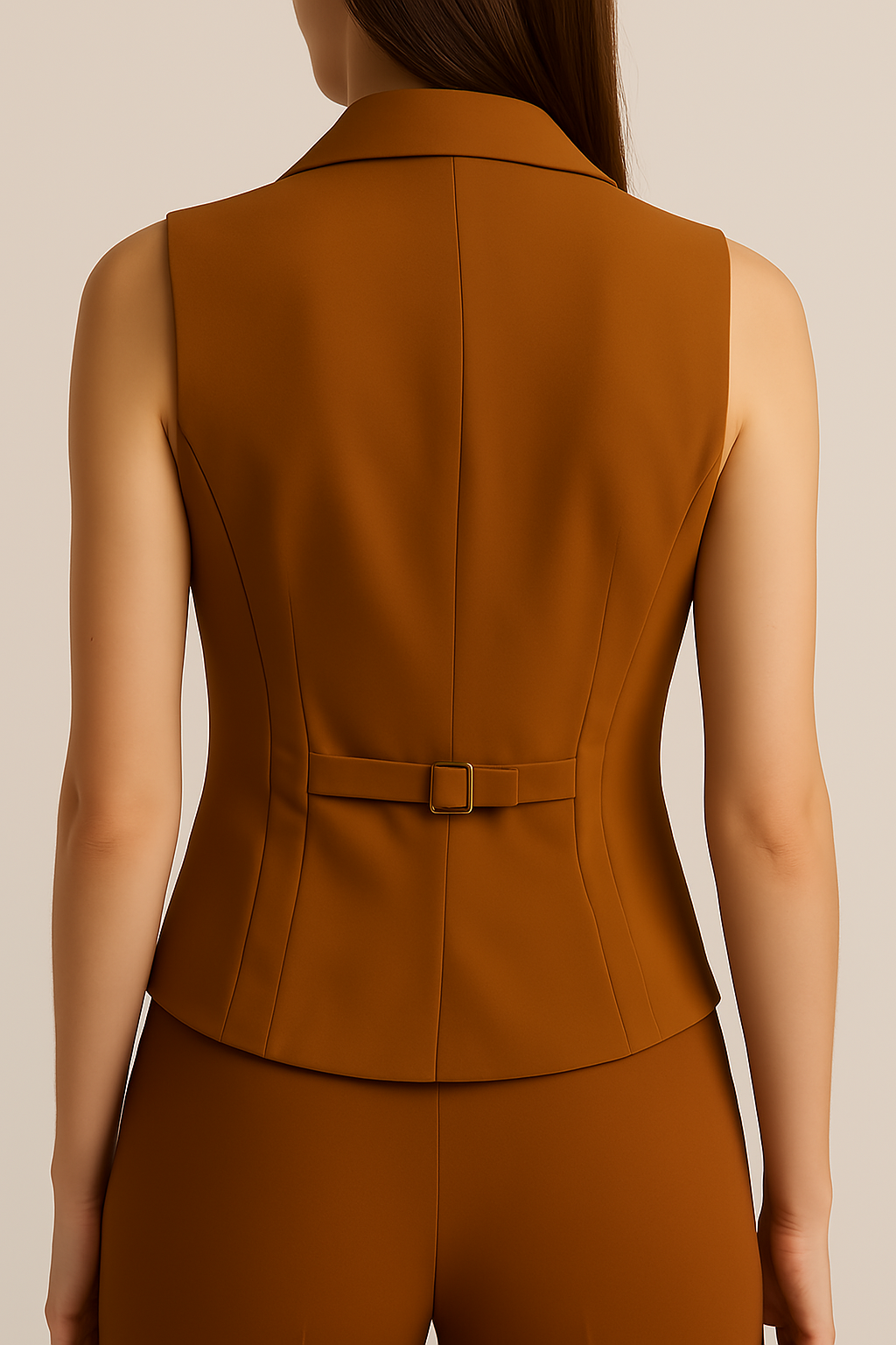 A cor caramelo é um diferencial estratégico: foge do lugar-comum dos tons escuros e proporciona uma leitura calorosa, acessível e refinada. É perfeita para compor com acessórios dourados, marfim, terracota, branco ou off-white, além de valorizar tecidos naturais como o linho, a seda e o algodão premium. Em combinação com peças minimalistas, o colete se destaca ainda mais e confirma seu papel como peça curinga de um guarda-roupa inteligente.