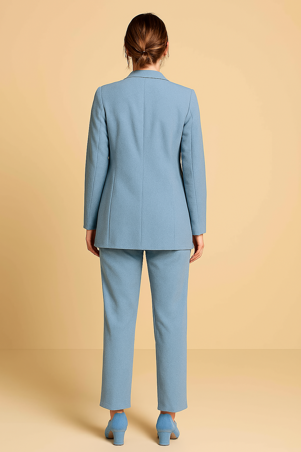 A calça de alfaiataria que compõe o conjunto é um verdadeiro exemplo de equilíbrio entre estrutura e conforto. Com cintura alta e corte reto, ela valoriza a silhueta feminina, oferecendo um caimento impecável que alonga as pernas e afina a cintura. O fechamento é discreto, com zíper embutido e cós limpo, mantendo a estética sofisticada e funcional. O comprimento da barra é pensado para harmonizar com diferentes tipos de calçados, desde scarpins clássicos até sandálias de salto ou botas de cano curto. A calça é versátil e pode ser usada tanto com as outras peças do conjunto quanto de forma independente, compondo looks variados para diferentes ocasiões.