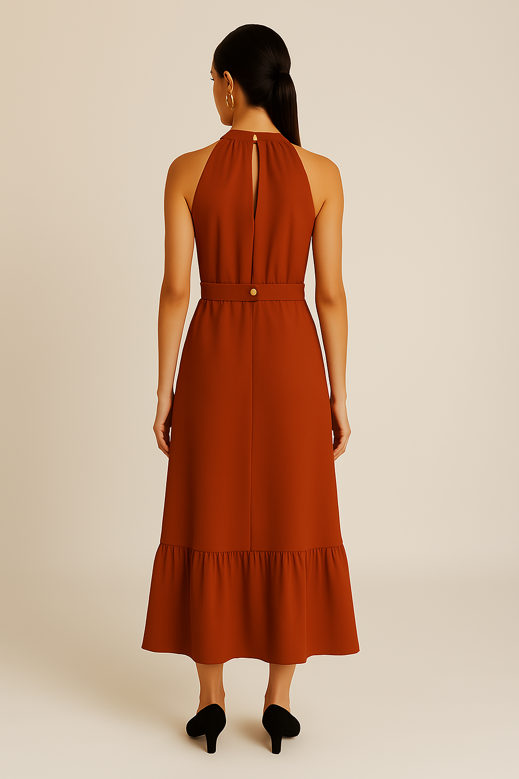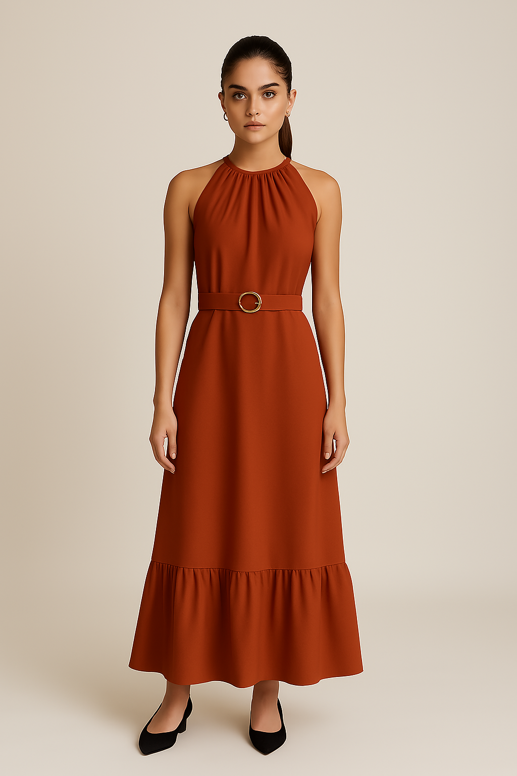 O cinto é confeccionado com o mesmo tecido da peça, criando continuidade visual e valorizando a silhueta de forma elegante. Sua fivela em tom metálico dourado acrescenta um ponto de luz à composição e remete à estética refinada de acessórios clássicos. Como você solicitou, o fecho do cinto também possui botão delicado, pensado para unir funcionalidade à estética em um detalhe que faz toda a diferença. O caimento da saia longa é fluido, com uma leve estrutura que permite movimento sem adicionar volume. A barra com babado sutil reforça a feminilidade da peça e proporciona um acabamento que se destaca pelo requinte e pela leveza.