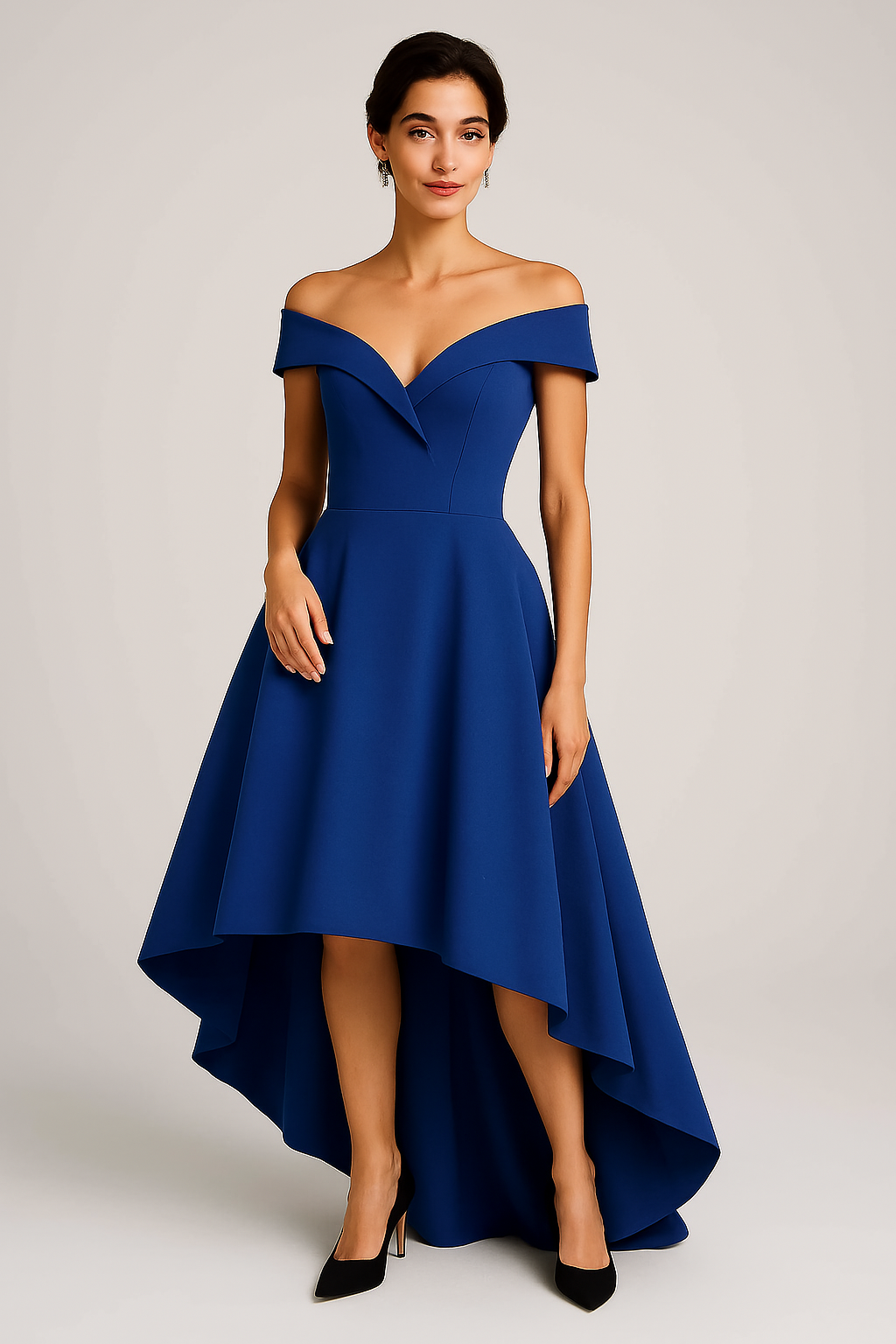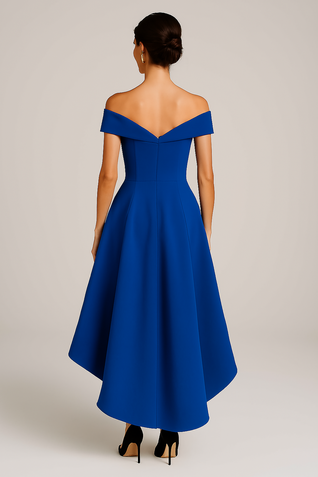 A cintura é bem definida, criando uma linha suave e favorecedora que conduz ao detalhe mais dramático do vestido: a saia em estilo high-low. Na frente, o comprimento é estratégico — curto o suficiente para mostrar os sapatos e alongar a perna, mas sem comprometer a elegância. Já na parte de trás, a saia se estende em uma curva fluida e imponente, proporcionando movimento a cada passo e garantindo uma presença memorável em qualquer ambiente.